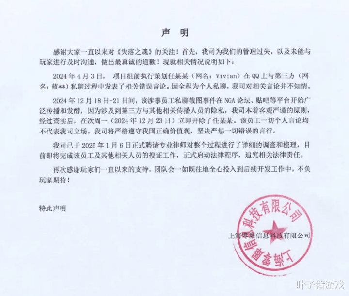 随着事件的进一步发酵,到今年2月25日《失落之魂》官方终于发布声明予以了回应。文中对玩家们进行了道歉,并提到这位涉事的执行策划,早在去年12月23日就已经被开除了。