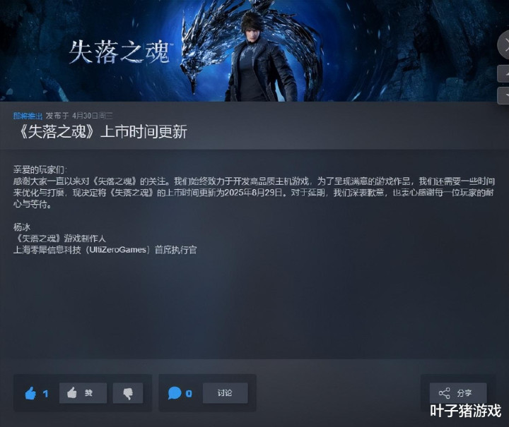 今日,《失落之魂》的开发商零犀科技正式宣布,这款原定于5月30日上线的国产动作游戏,将延期至8月29日发售。